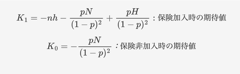支払われる金額をH円、毎月の保険料をh円、保険期間(月)をnカ月, 入院時にかかるお金をN円、人生の中でたった一回だけ入院する確率をp