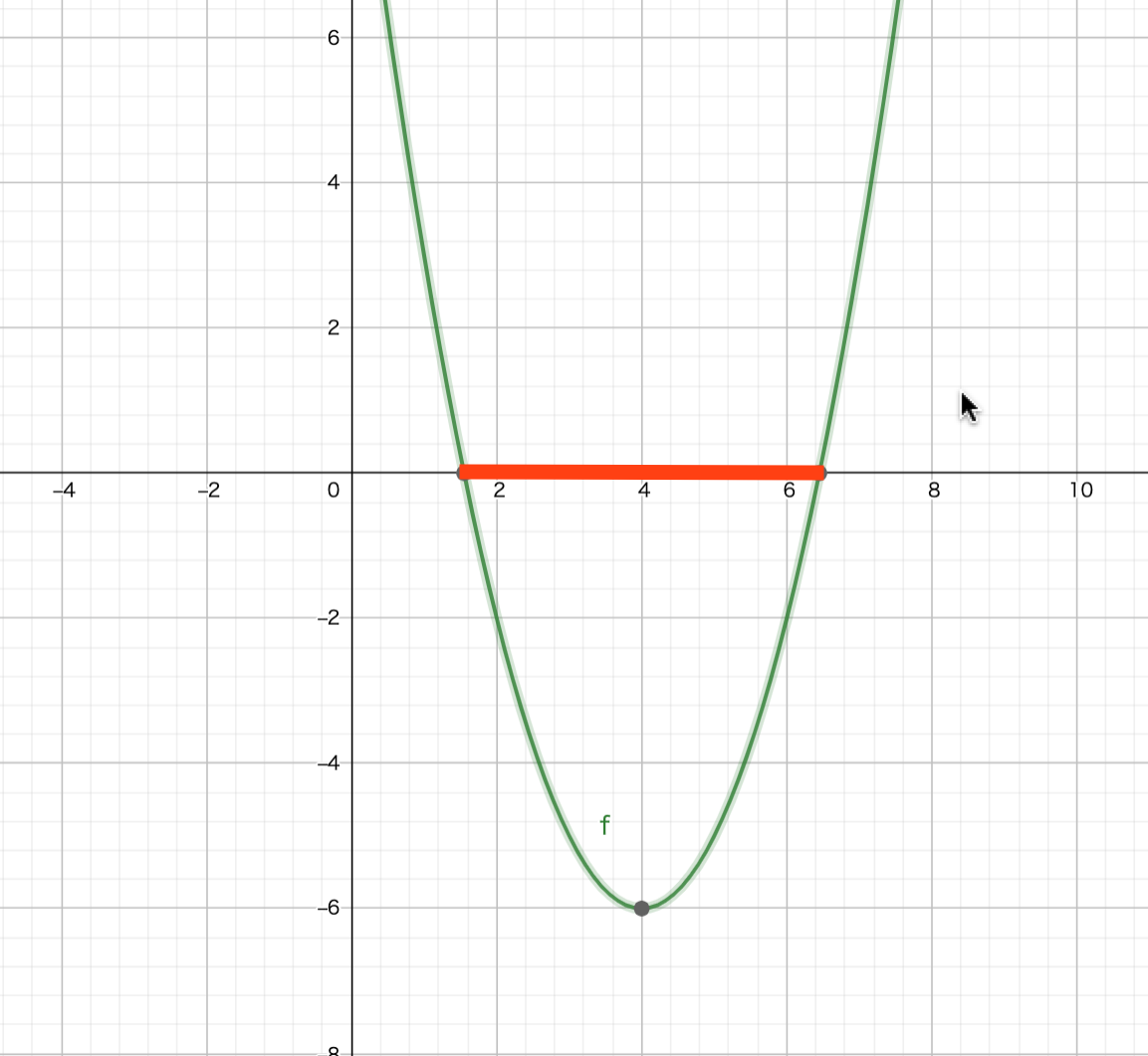 この関数が0より小さくなるのは、下の図で言うと赤い線のところです。数値は適当です。